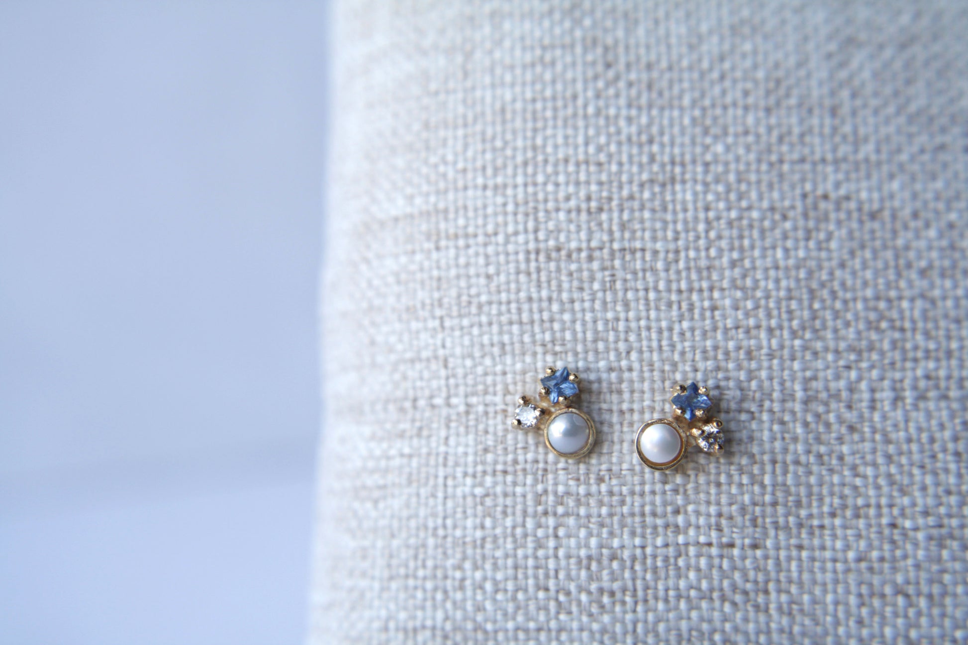 Aretes pegados tipo "studs" con zafiro azul, diamante y perla cultivada, cada par es único así que recibirás el que ves en la foto.