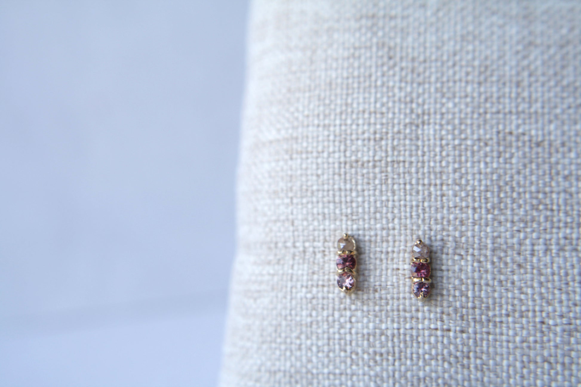 Aretes pegados tipo "studs" con zafiros en tonos rojos y diamante rosecut, cada par es único así que recibirás el que ves en la foto.